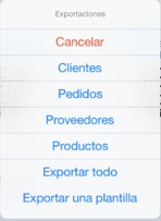 Exportación de Clientes, Pedidos, Proveedores, Productos, crea un archivo con todos los clientes, pedidos, proveedores o productos de nuestra base de datos y con el nombre LiteDataBase.csv el cual podemos enviarlo a otra app ( Dropbox, e-mail, etc.). también lo podemos utilizar como plantilla.